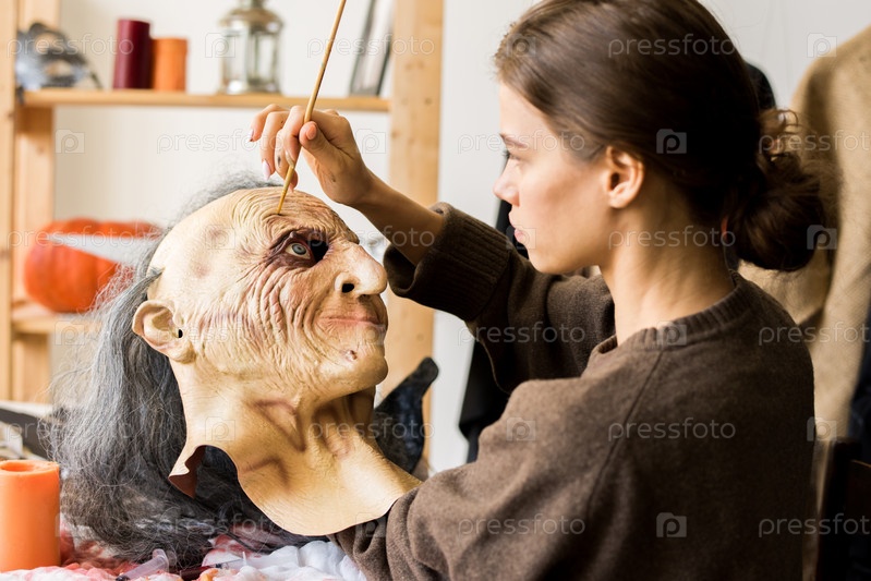 Серьезная женщина сосредоточена на изготовлении масок