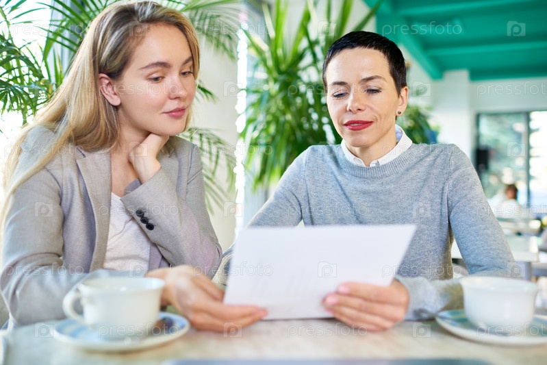 Две деловые женщины читают контракт