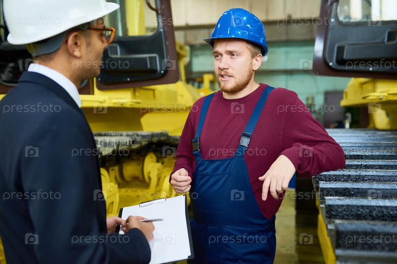 Работник разговаривает с менеджером на заводе