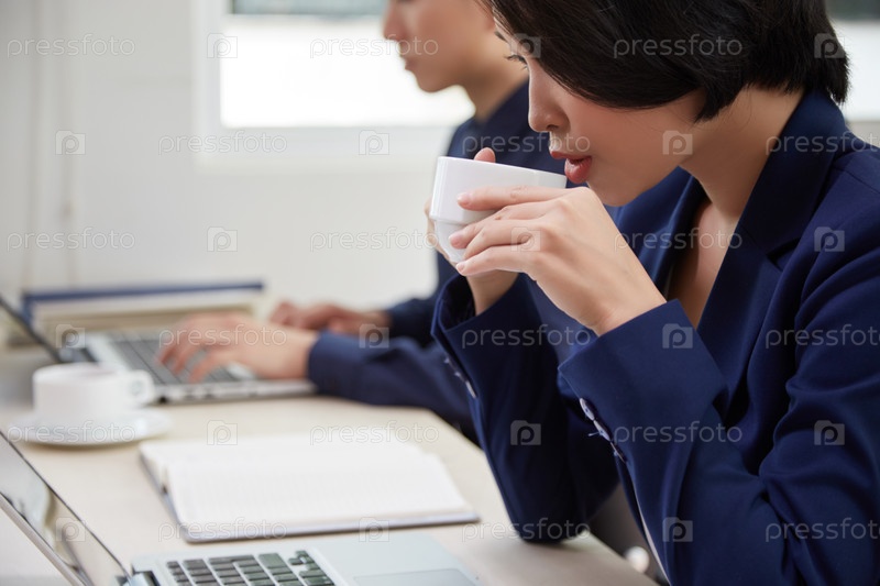 Деловая женщина пьет кофе во время работы