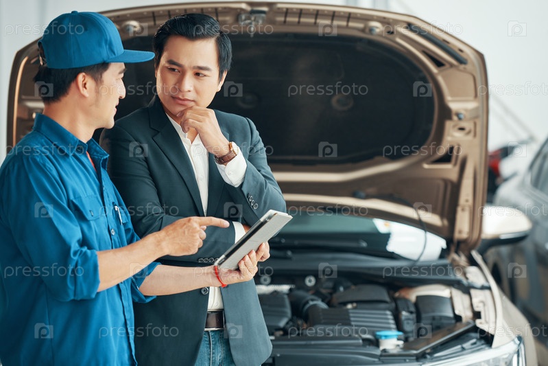 Мужчины обсуждают проблему автомобильного двигателя