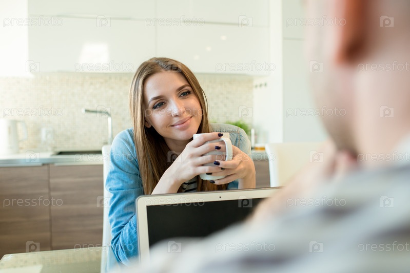Улыбающаяся женщина с любовью смотрит на мужа