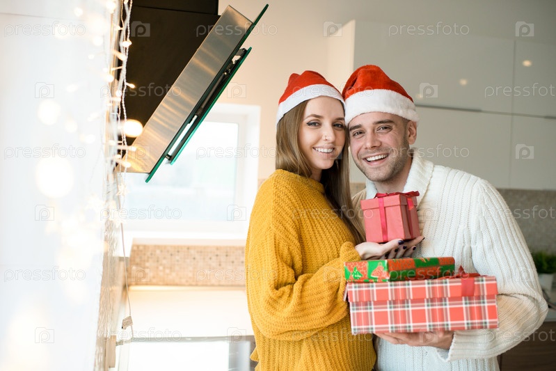 Улыбающаяся пара с новогодними подарками на кухне