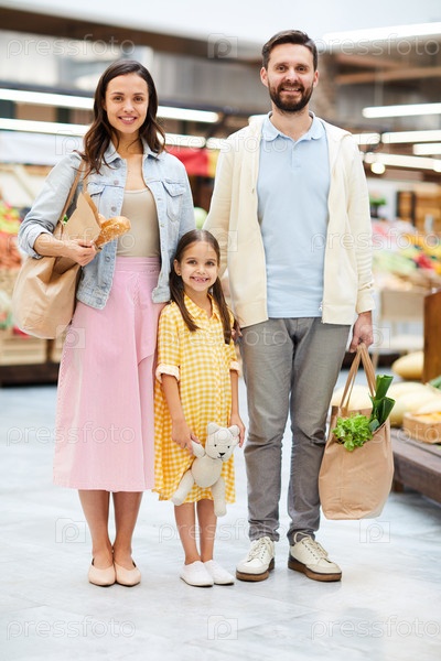 Улыбающаяся молодая семья делает покупки вместе