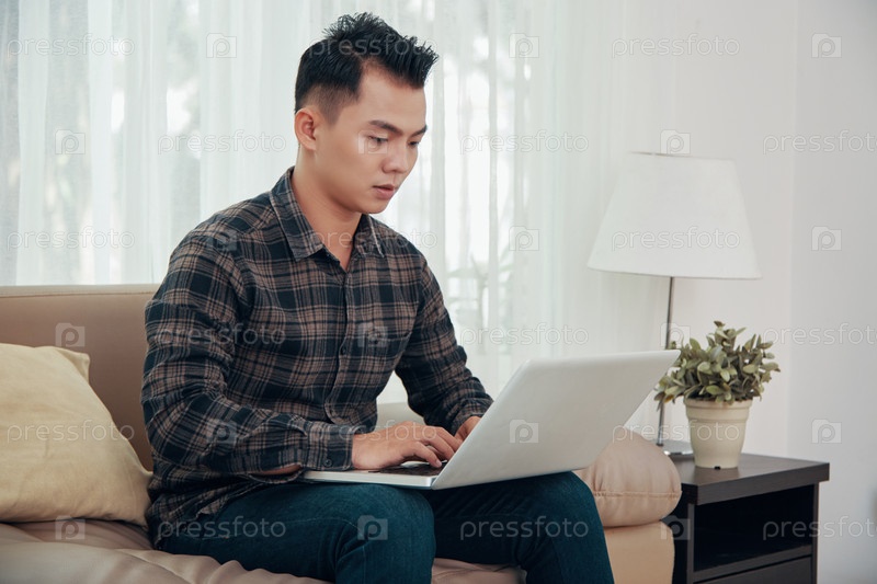 Молодой человек использует ноутбук дома