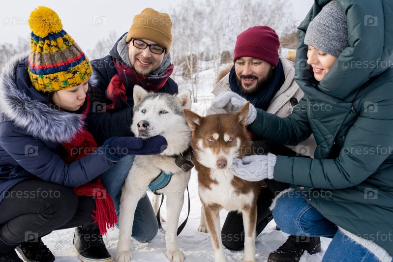 Молодые пары играют с хаски-собаками