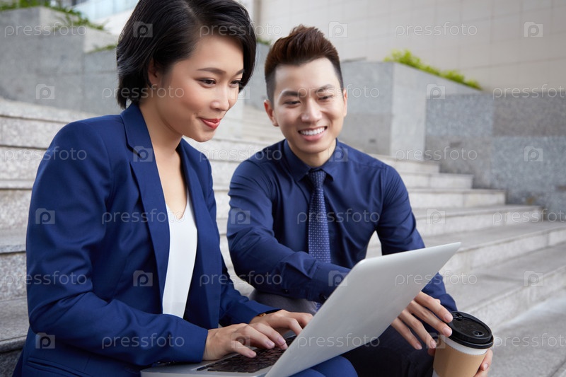 Бизнесмены, использующие ноутбук на открытом воздухе