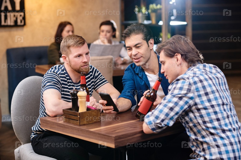 Контент-друзья пьют пиво и смотрят видео на смартфоне