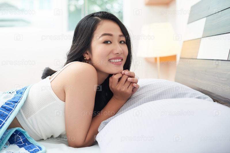 Красивая азиатская женщина под одеялом в постели