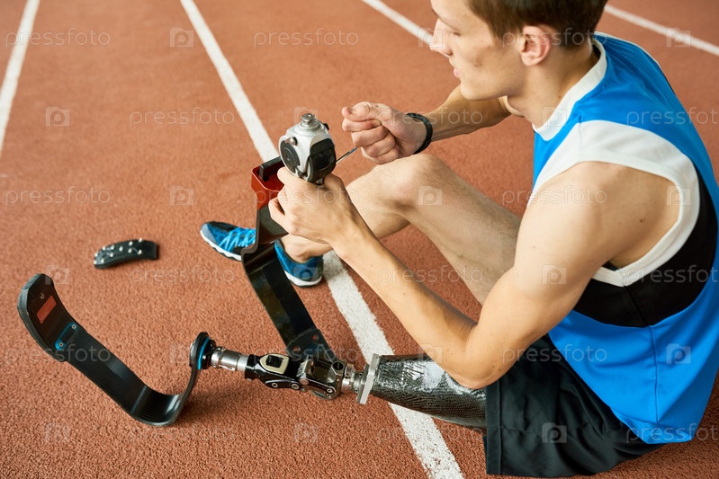 Инвалидный спортсмен, ремонтирующий протезированную ногу