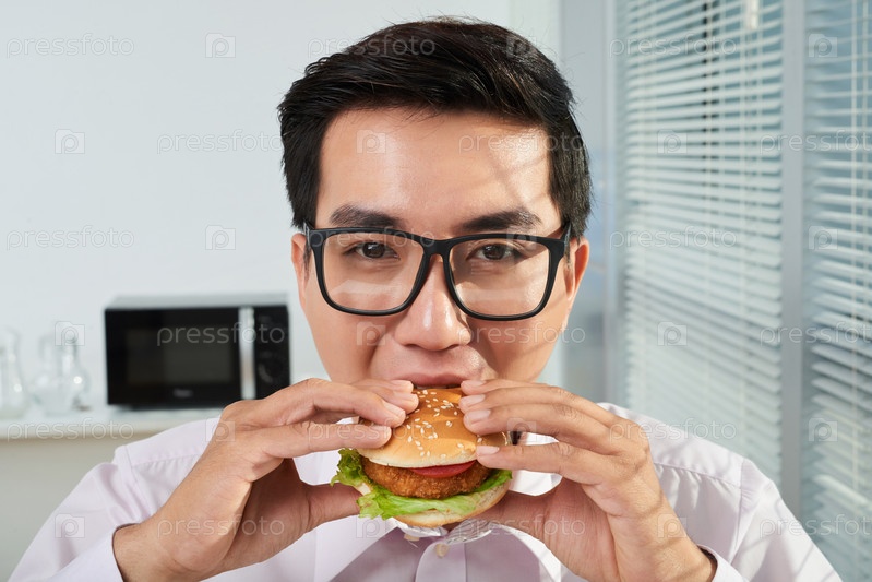 Бизнесмен ест гамбургер