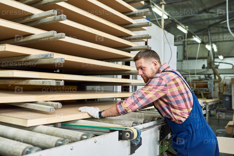 Фабричный рабочий складывает древесину в мастерской