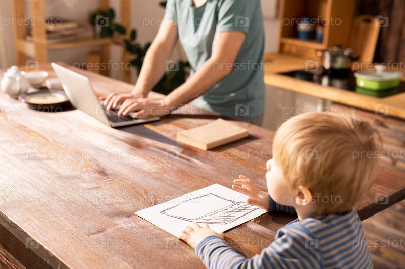 Маленький мальчик, печатающий на вытянутом ноутбуке