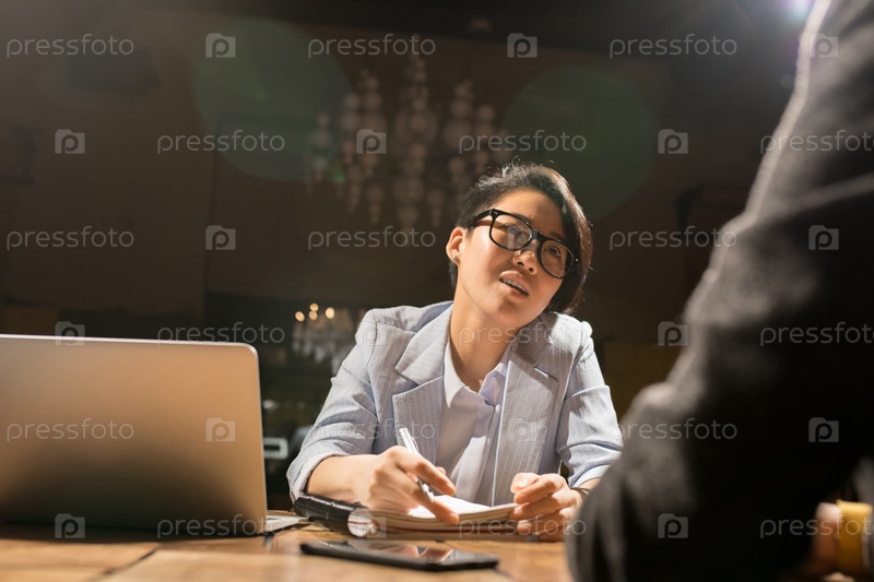 Азиатская леди работает с коллегой в темном офисе