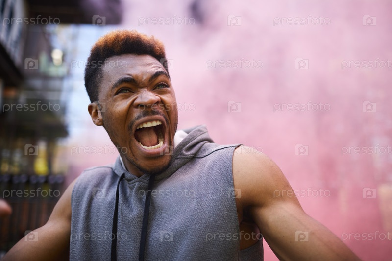 Эмоциональный черный спортсмен в дыме