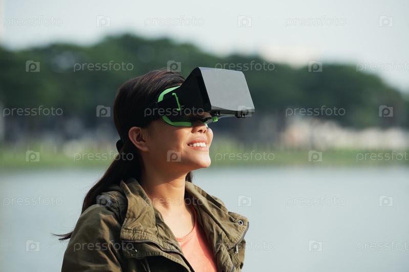 Радостная женщина в гарнитуре VR
