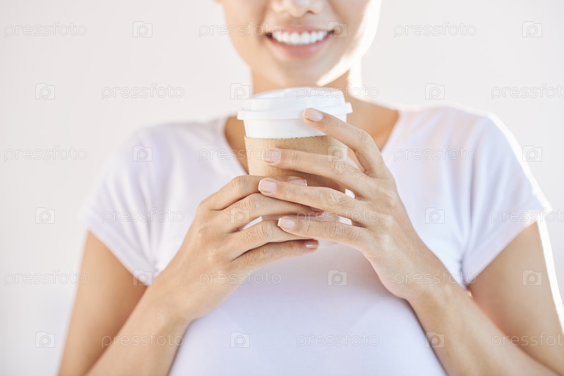Женщина с урожаем держит чашку кофе, чтобы забрать
