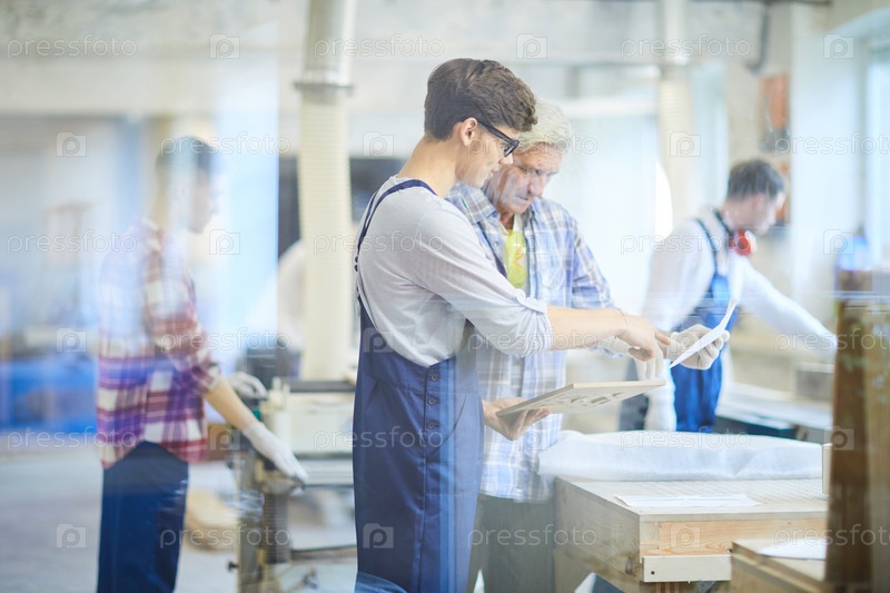 Концентрированный плотник изучает эскиз молодого рабочего