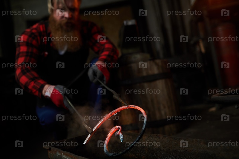Брутальный кузнец, держащий металлический стержень в щипцах