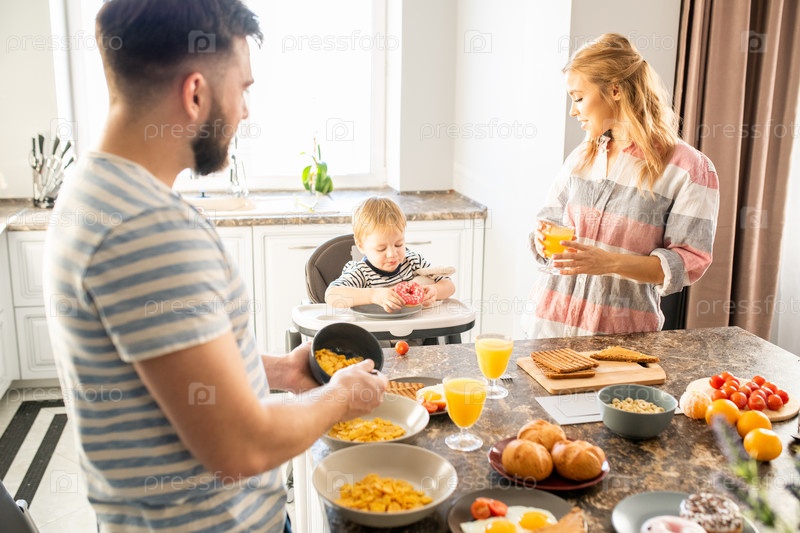 Молодая семья наслаждается завтраком с малышом