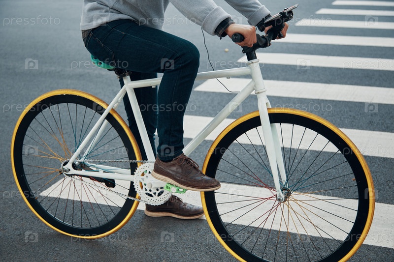 Человек с урожаем, едущий на велосипеде возле пешеходного перехода