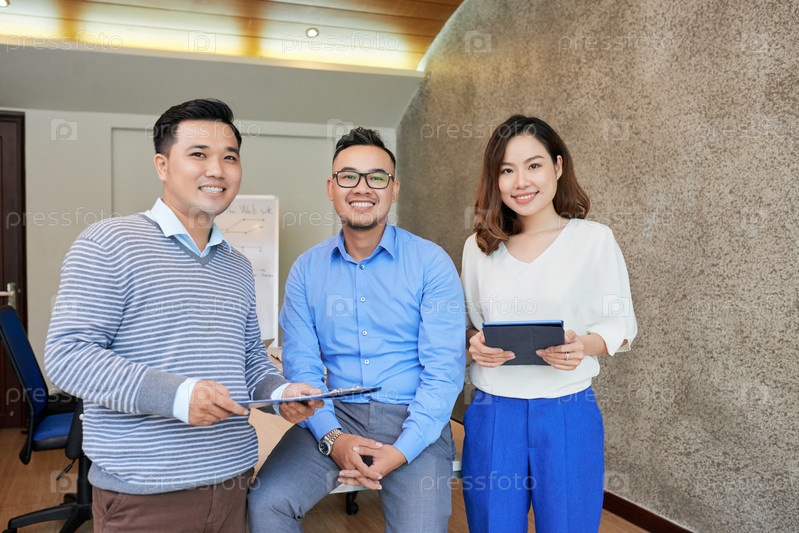 Улыбающиеся этнические коллеги, стоящие в офисе