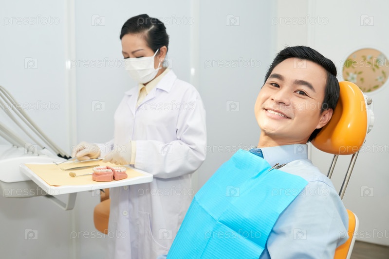 Улыбающийся этнический мужчина в стоматологическом кресле