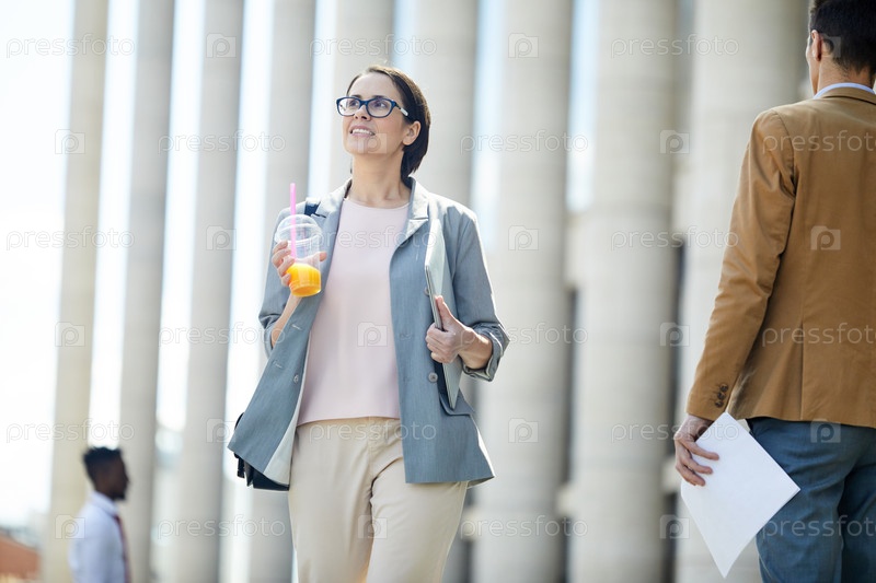Улыбающаяся бизнес-леди гуляет рядом с офисным зданием