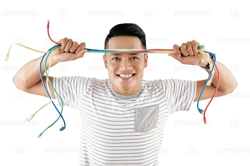 Счастливый человек с кабелями USB