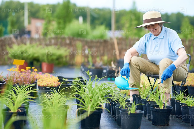 Старшая женщина орошает растения в саду