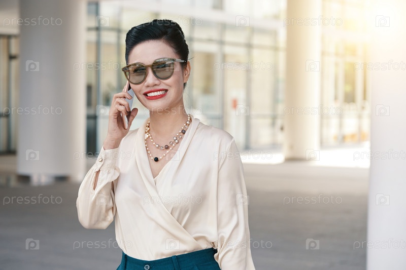 Веселая деловая женщина, разговаривающая со смартфоном