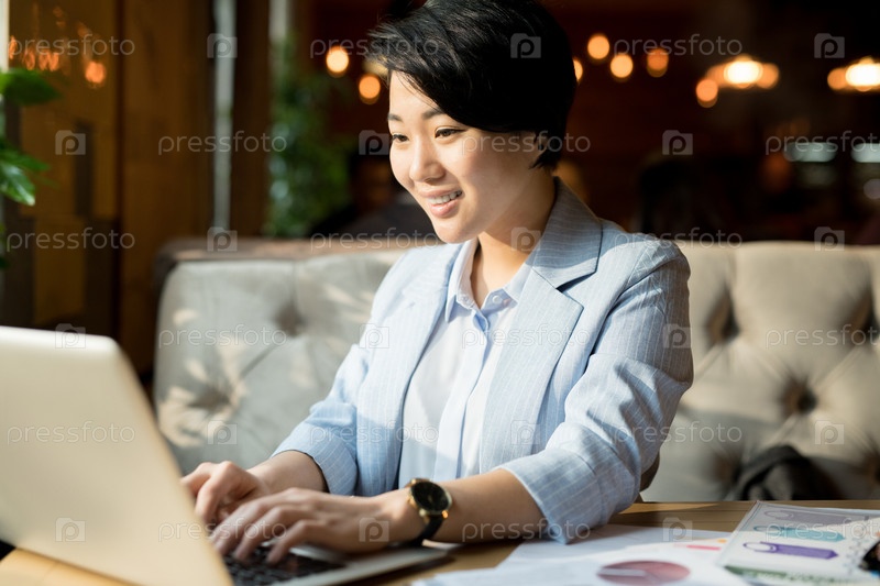 Позитивный азиатский менеджер готовит отчет в кафе