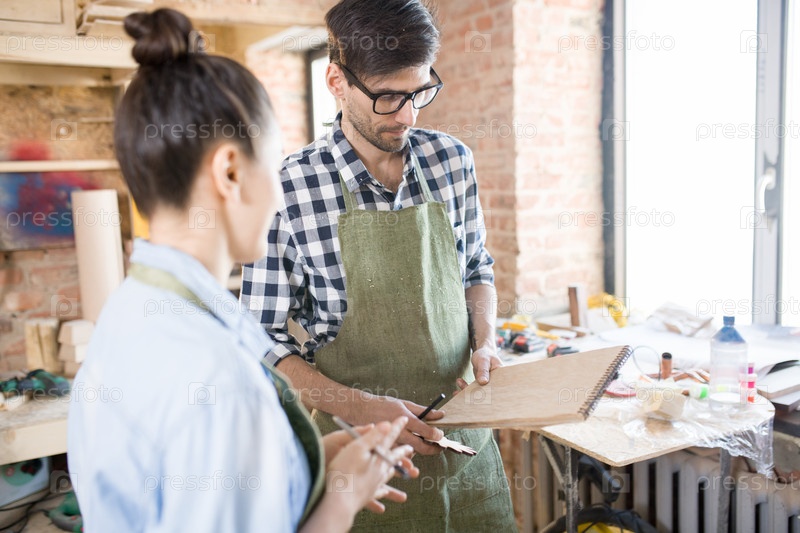 Два ремесленника обсуждают работу в столярном магазине