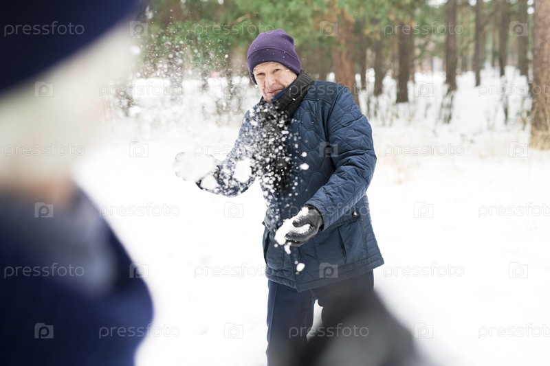 Старший человек в борьбе со снежным мячом