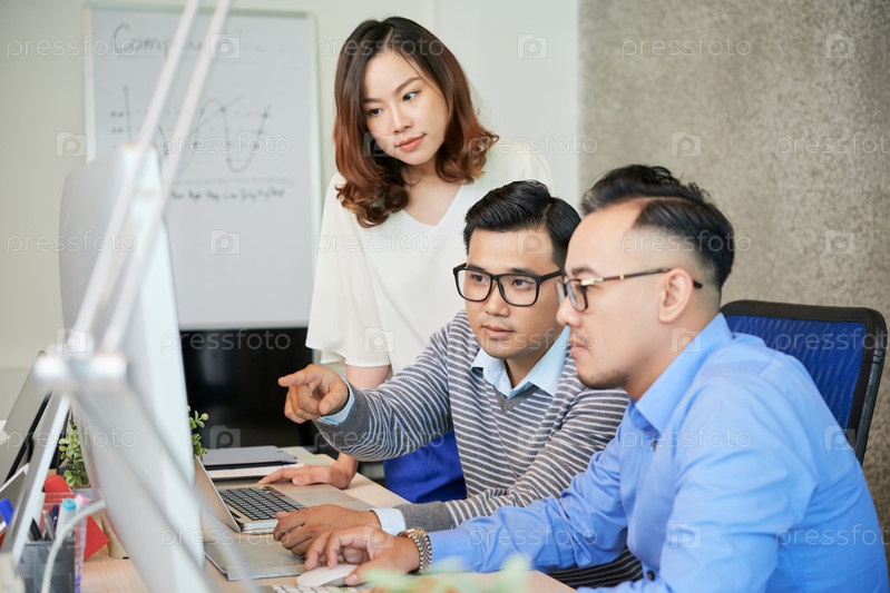 Молодые этнические бизнесмены используют компьютер и разговаривают