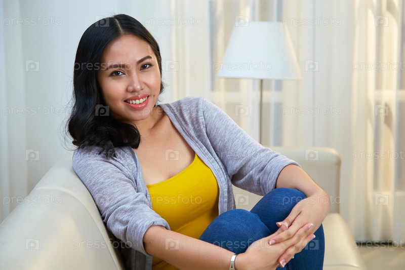 Красивая женщина сидит на диване
