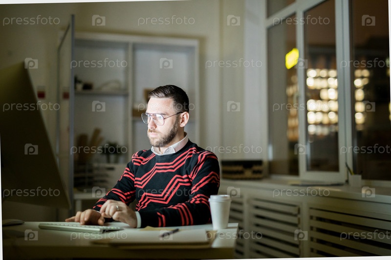 Молодой человек работает допоздна в офисе