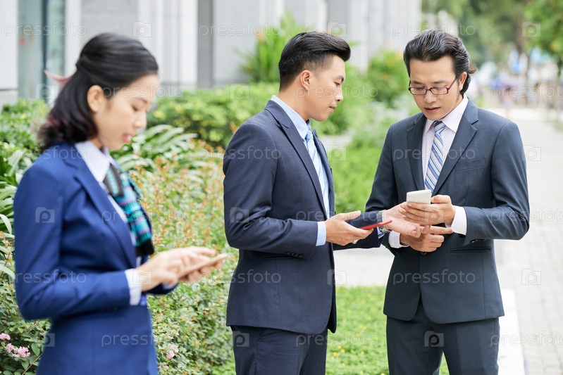 Азиатские бизнесмены с телефонами ведут дискуссию на открытом воздухе