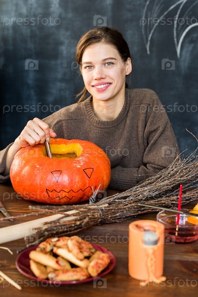 Счастливая девушка готовит украшения на Хэллоуин