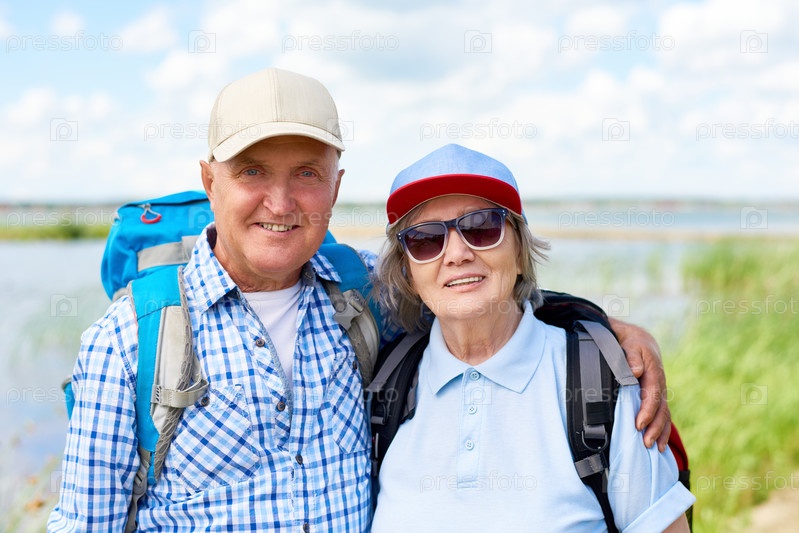 Пожилые туристы позируют счастливыми