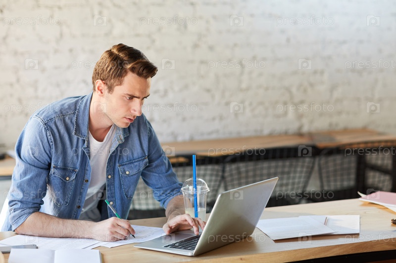Красивый молодой человек пользуется интернетом в кафе