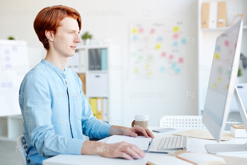 Красноволосый графический дизайнер работает в офисе