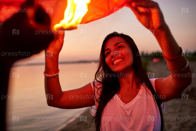 Счастливая милая девочка, держащая небесный фонарь с другом