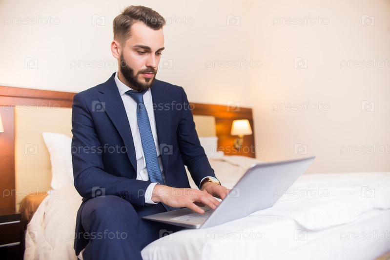 Красивый бизнесмен использует компьютер в гостиничном номере
