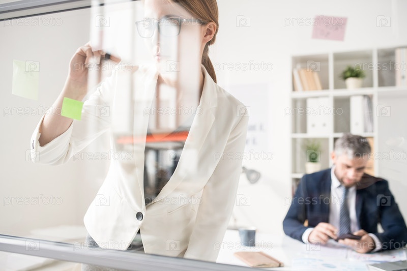 Концентрированная леди делает заметки, работая над маркетинговым проектом