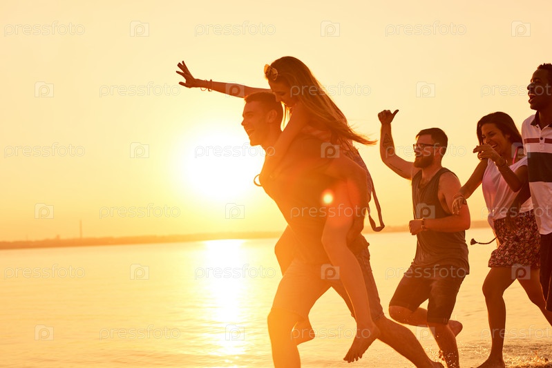 Смешные друзья, бегущие по воде в свете заката