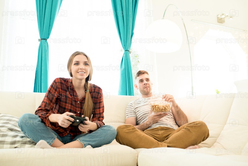 Взволнованная девушка играет в видеоигры, пока парень ест попкорн