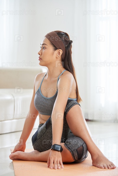 Женщина, выполняющая полуспинальный твист
