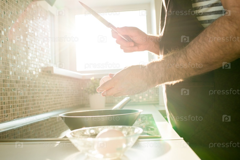 Человек ломает яйцо над сковородкой