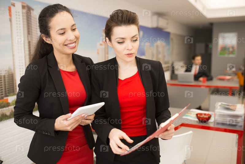 Две деловые женщины обсуждают работу в офисе